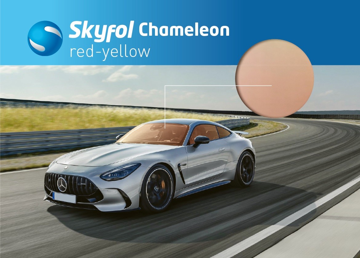 Skyfol Chameleon Red-Yellow on näyttävä punaisen ja keltaisen välillä väriään vaihtava auton lasien tummennuskalvo / sävytyskalvo.